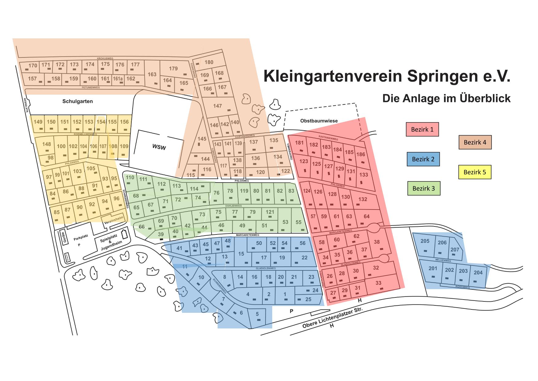 Unsere Kleingartenanlage ist mit ihren 186 Gärten so groß, dass sie in 5 Bezirke eingeteilt ist: Gartenplan